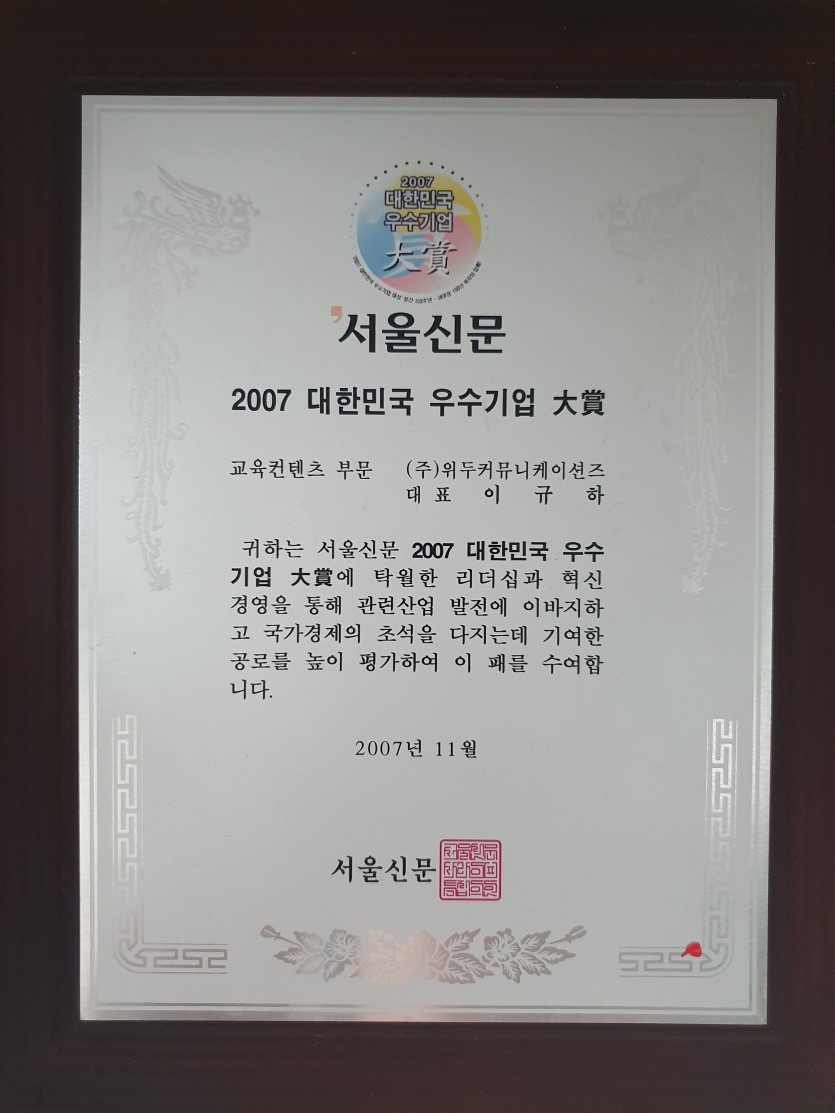 2007 대한민국 우수기업 대상 페이지 정보 작성자 WeDu 댓글 0건 조회 5,576회 작성일 19-05-30 19:31 본문 2007-11-00 대상 교육 콘텐츠 부문 2007 대한민국 우수기업 대상 서울신문 List Previous제 8회 디지털 이노베이션 대상 19.05.30