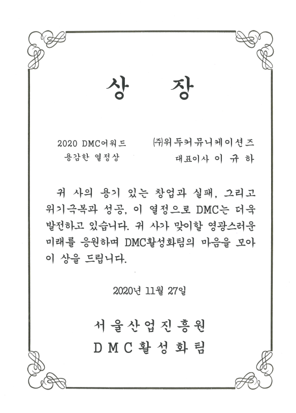 2020 서울산업진흥원 2020 DMC어워드 페이지 정보 작성자 WeDu 댓글 0건 조회 5,362회 작성일 21-12-31 12:57 본문 2020-11-27 2020 DMC어워드 용감한 열정상 서울산업진흥원 DMC활성화팀 List Previous2020 기술혁신 우수기업 21.12.31 Next2018 소년한국 우수 어린이 도서 19.05.30