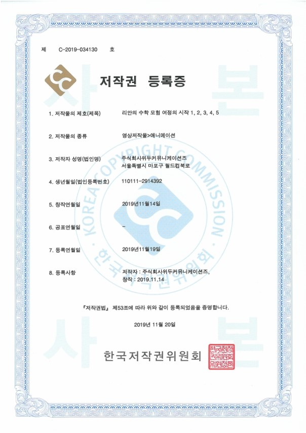 [한국/저작권] 리안의 수학 모험 여정의 시작 1,2,3,4,5 페이지 정보 작성자 WeDu 댓글 0건 조회 5,617회 작성일 21-12-31 12:36 본문 2019-11-20 저작권 C-2019-034130 영상저작물>애니메이션 List Previous[한국/저작권] OLL KIDS/MATH 21.12.31 Next[한국/저작권] 리안의 수학 모험 애니메이션 OST 19.11.25